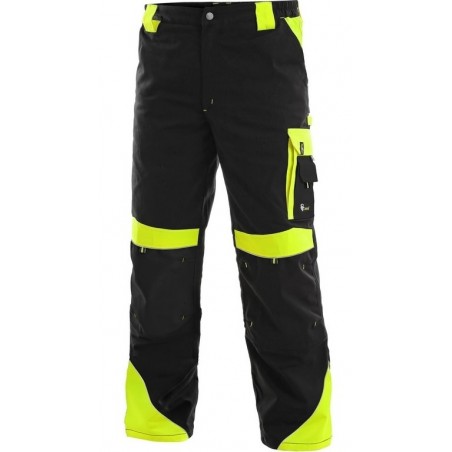 Pánské kalhoty do pasu, zesílená kolena s možností vložení kolenních výztuh, pevný pas s poutky na opasek, přední klínové kapsy, zadní kapsy s klopami, boční multifunkční kapsy, reflexní doplňky. Norma EN ISO 13688. Gramáž 270 g/m2. Materiálové složení 65% polyester, 35% bavlna. Typy barevného provedení: černo-oranžová, černo-žlutá, černo-modrá. Vel.: 46-64. V barvě černo-žlutá velikosti: 44-68.