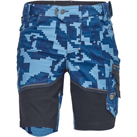 Pánské pracovní šortky, elastický inovativní materiál TRIFIBETEX® v přírodním maskování, ergonomický střih, snížený pružný pas, odolné trojité prošití nohavic a sedu, prostorné multifunkční přední kapsy s poutky na nářadí, 2 zadní kapsy na suchý zip, stehenní kapsa na telefon s klopou a zapínáním na suchý zip, kapsa na metr a nůž, poutko na kladivo, "D" kroužek, poutko na nářadí v pase, originální zpracování zapínání kalhot, reflektivní prvky v barevném odstínu. Svrchní materiál: 62 % bavlna, 35 % polyester, 3 % Spandex, 260 g/m², TRIFIBETEX. Svrchní zesílená vrstva: 95 % polyamid (nylon), 5 % Spandex, 230 g/m², CORDURA®. Norma EN ISO 13688. Střih: slim. Barvy: navy, petrolejová, antracit, olivová. Velikost 46-64.